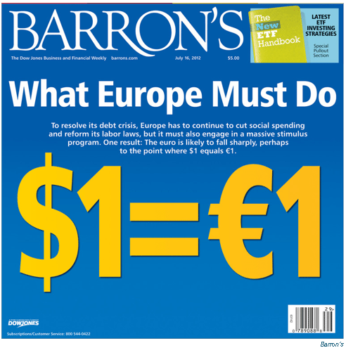 En faisant ma revue de presse ce jour, je suis tombé sur cette couverture de BARRON’S mettant en valeur la parité euro et dollar si l’Europe ne trouve pas des moyens de faire face à la crise de la dette. Ni une ni deux, j’ai prit le chemin d’un achat de la paire euro dollar basé surtout sur du graphique, hein, je voudrais pas faire peur non plus. Ainsi on assiste à une tendance baissière long terme sur l’euro dollar on peut le voir dans le canal baissier en orange. Mais à l’intérieur de ce canal baissier on peut également former un biseau descendant avec un niveau de support atteint qui devrait au moins nous libérer un rebond technique. A suivre.