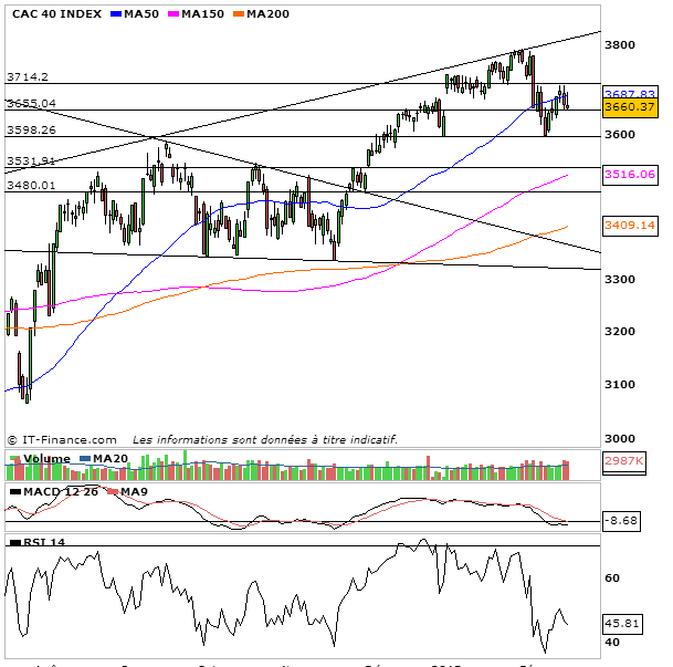 La seconde jambe de baisse semble toute proche de se lancer après ce rebond qui l’on avait pu constater n’était que technique et qui n’aura donc pas pu dépasser les 3710 points. Ce qui avait pu me laisser perplexe quant à une poursuite de la hausse et après une période d’observation me pousser à reprendre des positions en vente à découvert. Maintenant donc, il ne reste plus que le support des 3655 points, et une fois celui-ci cassé à la baisse comme le chemin semble s’en prendre, la route sera libre pour les baissiers, et engager la seconde jambe de baisse qui aura pour objectif de rejoindre la zone des 3530-3550 points.