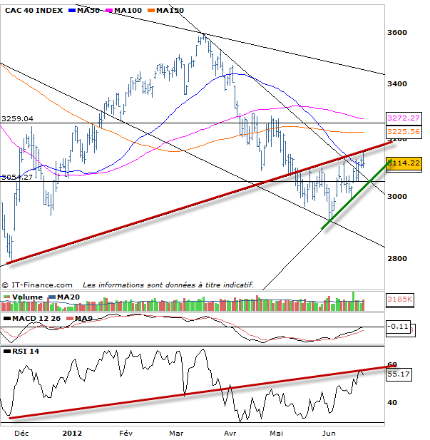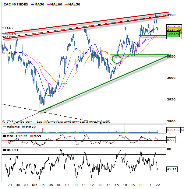 demain donc sous 3115 points le cac 40 rentrerait en consolidation, sous 3099 points, on irait probablement chercher les 3053 point avant un rebond et ensuite la décision finale quant au sens de cassure de cette figure. Ce pourquoi je titrais voilà deux jours, encore deux scénarios possibles, toujours d’actualité en étant dans cette figure. On continue donc de prendre ses profits dès que on le peut.