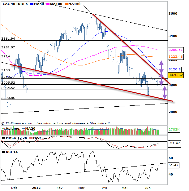 Voilà qu’en ce jour des sorcières, le cac 40 nous donne un signal haussier en brisant les 3055 points après être repassé avec un gap haussier d’ouverture au-dessus des 3037 points. Du coup avant ce weekend, c’est l’occasion de se poser des questions. Hier soir en effet, les indices américains ont interprété positivement une annonce comme quoi BCE et FED se tenaient prêtent à lâcher encore des billets si cela s’avérait nécessaire suite aux élections grecques. Du coup cela relâche la pression sur les marchés, les acheteurs pensent à nouveau pouvoir acheter sans risque, car de toute façon si cela baisse, les banques centrales tiendront le tout à coups de planche à billet. C’est justement dans des périodes comme cela où on semble pouvoir gagner à tous les coups que l’on a droit à de belles séances euphoriques. Mais s’il faut bien évidemment en profiter et être opportuniste, il ne faut pas non plus se leurrer. Rien n’est réglé et le marché continue de monter sur une certitude que les banques centrales feront office de chevalier blanc sur toute mauvaises nouvelle. Sur le plan économique d’ailleurs, la machine à croissance semble s’enrailler et prouver que celle-ci n’est pas encore auto-entretenue. Les mauvaises stats sont accueillies avec du vert car tout ceci laisse entendre que la semaine prochaine la FED pourrait bien annoncer soit un QE3 soit une baisse des taux (on se rapproche du Japon). Les élections grecques s’annoncent donc peut être comme un non évènement, car si les banques centrales sont prêtes à agir c’est que peu importe le scénario cela montera. D’ailleurs il faut ne voir dans le signal haussier du jour que cela et rien d’autre de plus, car la tension, et les doutes que l’on avait depuis plusieurs jours ne pouvaient être levés que par une annonce du celle-là , seul catalyseur haussier actuellement, puisque économiquement ça coule.