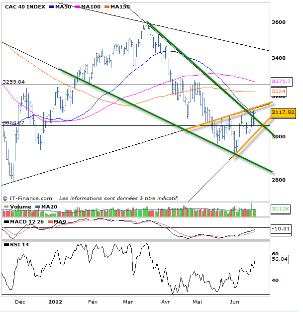 De manière parfaite le CAC 40 après avoir fait un faux départ hier matin s’est servi du point pivot des 3053 points pour ne pas remettre en question sa tendance acheteuse et donc même la mettre durablement en place après une séance ce jour digne d’un rallye dans les dernières heures. Cela permet de conclure une chose : la puissance et l’importance du point pivot sur les 3053 points. Au-dessus la tendance est acheteuse et on se paye le luxe aujourd’hui de conclure en cassant effectivement le biseau descendant que l’on avait sur le cac 40 depuis les 3600 points. La cassure de ce biseau libère un potentiel haussier sur 3256 points. Voilà pour un des scénarios mais il en a un autre à ne pas négliger. Celui de la formation actuellement du coup d’un biseau ascendant de résistance oblique haussière 3143 points et de support oblique haussier 3053 aujourd’hui demain 3057. Ce qui veut dire que oui la tendance est haussière au-dessus des 3053 puis 3057 en suivant l’oblique support mais qu’il ne faut pas espérer d’emballement tant que la figure n’est pas cassée à la hausse, c’est à dire rester prudent tant que 3143 fait office de résistance avec toujours ce risque de rompre par le bas cette figure qui relancerait une volonté baissière.