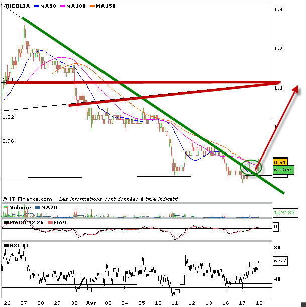 L’arrivée du CAC 40 sur les 3290 points et la forme de la plupart des actions devrait profiter également aux petites capitalisations. l’occasion de voir que le titre Theolia connait quelques volumes nourris avec en prime un dépassement des 0,91 euros qui pourrait bien être le déclencheur pour engager un rebond. Ce rebond se heurtera aux 0,96 euros comme le dernier en date mais un passage de ce niveau ouvrirait la voie des 1,03 euros. Si ensuite les marchés reprennent une tendance verte durable on pourra même penser que Theolia sujet à l’euphorie pourra rallier les 1,07 voir 1,11 euros.