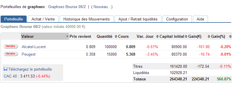 J’ai joué à fond le rebond du jour sur les 3460 points. Après coup, c’est vrai que cela à l’air facile la bourse mais j »en ai sué pour dégager quelques profits en tradant depuis deux jours. Du coup, jusqu’à mi aprem j’étais parti pour être liquide ce soir mais j’ai décidé de continuer à être agressif sur des actions voaltiles, Alcatel et Peugeot. C’es très risqué, en même temps je ne suis pas là pour du long terme, mais tout de même je ne conseillerai pas d’acheter maintenant. Il est vrai que c’est de la pure anticipation, que quelques % me suffisent, et qu’il n’y a à ce soir, en dépit d’un fort support côté us, toujours pas de signal d’achat. Le CAC 40 a buté contre LA résistance. Je vais y revenir dans une analyse cac.