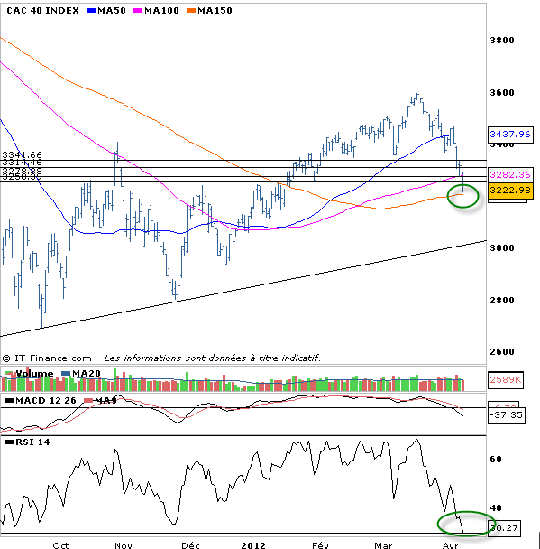 Ce fût violent et méchant mais la tendance baissière sur le cac 40 s’est affirmée en un sell-off. Alors que vendredi on avait pu jouer un rebond technique, il ne fallait pas faire confiance aux US et à la fermeture ce weekend de pâques, l’ouverture en gap baissier et la rupture baissière des 3290 puis des 3250 à fait plonger le cac 40 vers le support des 3217 points. Il ne reste plus que lui pour sauvergarder la tendance haussière engagée cet hiver. On est donc aller chercher ce support majeur très rapidement depuis le sommet des 3600 points et les craintes sur la poursuite de la hausse que l’on avait pu exprimer ici.