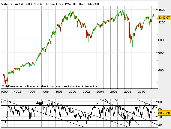 Hommage au passage à Jean Louis Aubert, pour ce post sur la fin du mouvement haussier sur le S&P 500. Comme vous pouvez le voir sur le graphe ci dessous petit à petit l’indice américain bascule, pose les fondations d’un nouveau bear market via la création d’un canal baissier en hebdomadaire sur le RSI, qui comme vous le constaterez vous même, a par le passé aboutit sans faillir au même effet c’est à dire la fin du mouvement haussier…
