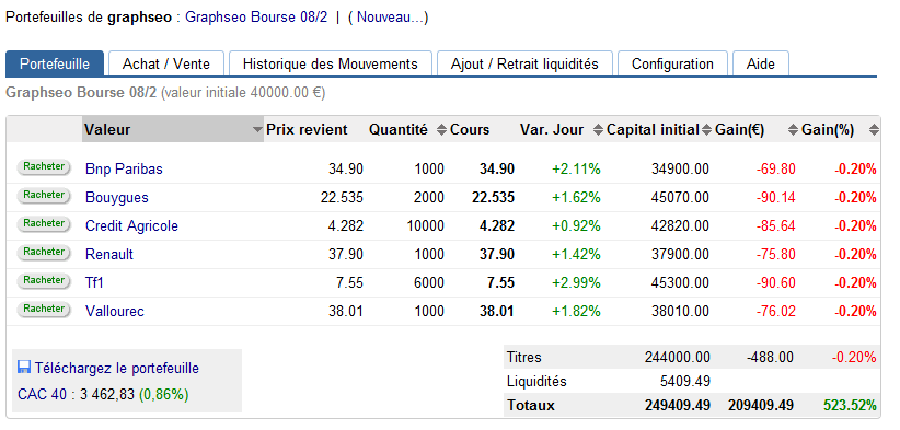 Je m’étais accordé un portefeuille vide avant le weekend redoutant une réaction acheteuse lors du retour des derniers vacanciers. Peut être me trompe-je mais j’accorde le rebond du jour à justement des achats à retardement. Les vraies résistances ne furent pas brisées et donc du coup le signal baissier est intact malgré ce rebond ce qui a favorisé après avoir observé toute la journée à repasser à la baisse à la faveur du test des 3463 points sur le CAC 40. J’ai sur pondéré les bancaires une nouvelle fois avec deux valeurs, BNP et Crédit agricole. Je joue la fin de la news sur Tf1, et une tendance qui s’effrite tout comme pour Bouygues et Renault qui pour moi surnagent sans réelle raison. Enfin je pense le rattrapage de Vallourec certainement long terme, mais avec un besoin de souffler à court terme. Quoiqu’il en soit je place le stop suffisamment proche sur 3479 points sur CAC 40, soit un passage des 3463 et des 3475 qui là me ferait douter sur le fait que cette hausse n’est due qu’aux retours des vacanciers retardataires.
