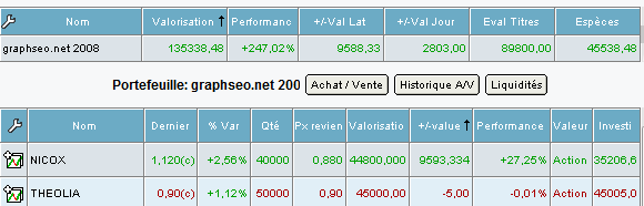 Je solde les lignes de St micro electronics et d’Alcatel. Je rentre une ligne de theolia aux côtés de la conservation de la ligne nicox. Des perfs proche des 20 % pour les lignes prises pré vacances de fin d’année ce qui permet d’inverser la vapeur sur la performance du portefeuille qui fleurte avec les +250% depuis sa création en 2008, un retour sur la performance que l’on avait fin 2010 après une année 2011 qui avec le mois d’août puis celui de novembre nous a fait perdre 200% de gains après un pic de la watch list à +450 % depuis février 2008. On verra ce que 2012 nous réserve. Je vais appliquer une stratégie plus hybride entre trading et investissement. Par exemple je reste positif sur des valeurs comme st micro et alcatel mais juge que l’on peut prendre ses bénéfices en attendant de se replacer plus tard pour une nouvelle vague haussière.