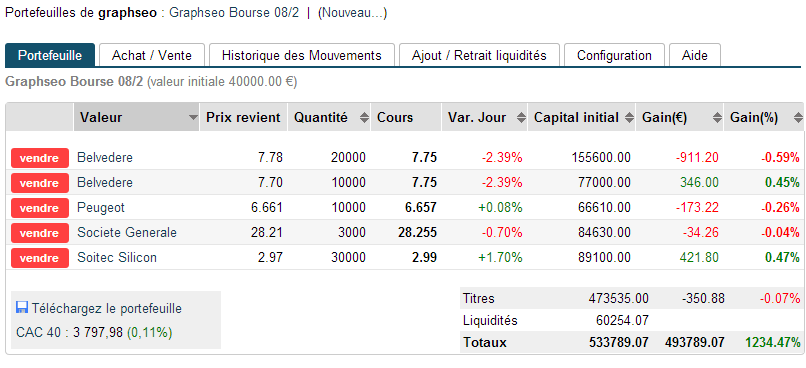 Comme je l’ai écris j’ai craqué aujourd’hui en achetant du belvédère. certes c’est de l’anticipation et il existe un risque donc, mais j’ai notamment bien apprécié le comportement du titre, dans du volume aujourd’hui et ce qui semble être un point bas et le début de la mise en place d’un rebond. Bien entendu il faudra voir la capacité de ce rebond à venir s’affranchir à nouveau des 8,80-9,30 euros pour vraiment se faire une idée. Cela reste un trade spéculatif. Comme vous avez pu le lire dans mon analyse d’hier et d’aujourd’hui je privilégie le rebond. Pour cela j’ai acheté du société générale, du Peugeot, j’ai loupé le coche pour Alcatel…J’ai également acheté du Soitec, non pas pour jouer un rebond mais parce qu’elle prépare quelque chose avec une tendance qui se tient bien depuis quelques semaines.