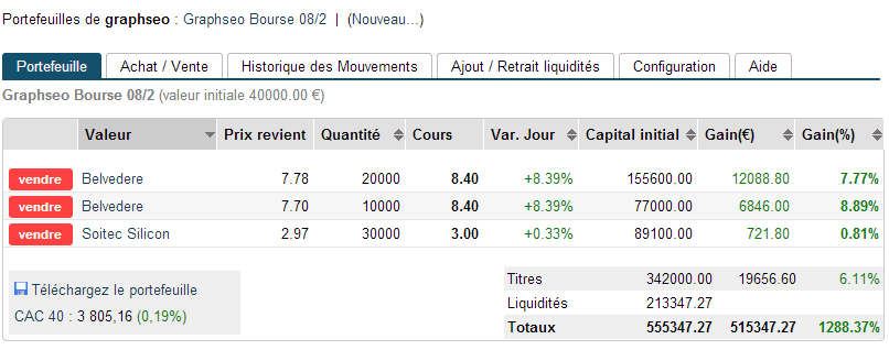 Ce premier vol d’A350 fut impressionnant. Un appareil très silencieux et qui a l’air très performant, et que dire de plus en sachant que ce n’était que le premier vol est donc certainement pas le profil de vol le plus économique. Bref, niveau bourse, devant l’incapacité du cac 40 à s’affranchir des 3830 points j’ai préféré lâcher avant le weekend mes positions à l’achat sur Société générale et Peugeot en maigre pv. J’ai conservé Belvédère et Soitec. Je me tâte à rentrer sur quelques smalls que je suis depuis un moment. je pense que le bon moment approche pour bon nombre de smalls. En attendant sur BVD, on a eu un beau rebond, mais il n’a pas buté n’importe où, je vous laisse prendre le graphique en 1 heure et tracer l’oblique baissière reliant les derniers points haut depuis deux semaines. C’est cette oblique qu’il faudra dépasser pour déclencher un rbeond de plus grande ampleur vers les 11 euros.