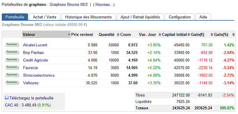 Je conserve les positions, c’est risqué, et hors de la stratégie j’en conviens. je me rattache au fait que la plupart des valeurs évoluent dans des biseaux ascendants, la hausse actuel permet un nouveau test sur bcp de titres de l’oblique haute. Si ces biseaux ascendants cassent finalement à la hausse, ce sur quoi on devrait être fixé demain, alors je rachèterai mes positions avec une belle perte en ayant voulu conserver des positons où j’aurais pu faire des allez retours et m’en sortir nettement mieux tout en conservant mon avis baissier…Réponse demain. dans le meilleur dès cas, je limite la casse mais la réalité est que si au final les trades seront sans doutes bons, il y a eu une perte d’opportunité due à un manque de rigueur.