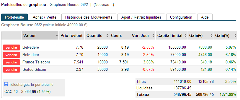 Journée plutôt calme puisque j’ai conservé les Belvédère, bonne idée ou pas, on sera vite fixé, pour la simple et bonne raison, et ce n’était pas arrivé de puis longtemps, la hausse se fait dans des pics de volumes alors que la baisse ou consolidation se fait dans de faibles volumes. Pour moi donc la dynamique reste haussière, et quitte à perdre l’acquis, je préfère conserver pour voir ce qu’elle a dans le ventre. Sinon, comme on pouvait s’y attendre le marché a lancé son rebond en dépassant les 3807 puis l’a renforcé en franchissant les 3825 puis 3837-3857 pour arriver proche des 3887 points, l’objectif. Dans ce départ haussier, je n’ai pas été assez rapide et je n’ai donc jeté mon dévolu que sur France Telecom, titre massacré, au fond du trou, mais qui lance ce jour un signal d’achat à moindre risque. J’ai donc pris une ligne en début de matinée.