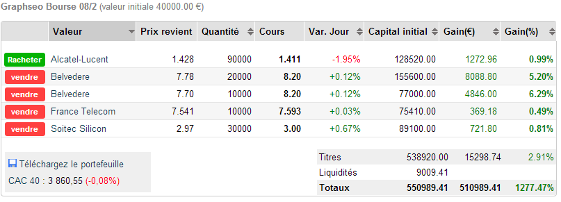 Petite mise à jour de la watch list. J’ai hésité ce jour entre reprendre des France telecom qui vienne de nous faire un pullback sur la ligne de signal d’achat court terme ou de prendre une position en vente à découvert sur Alcatel. Je conserve Belvédère toujours en consolidation, à suivre de près. Finalement j’ai choisi de prendre une vente à découvert sur Alcatel lucent, non parceque je pense que le cac 40 va baisser mais parceque je pense que Alcatel aujourd’hui a donné quelques signaux de prises de profits. La valeur demeure en tendance haussière, ma vente à découvert n’est là que pour grappiller une consolidation éventuelle rien de plus et je ne m’aventurerai pas à conserver la position trop longtemps. J’adopte donc des positions à l’achat et à la vente ce qui équilibre mon portif. France Telecom devrait continuer de faire mieux que le cac 40, à suivre, et Alcatel, devrait faire moins bien après une hausse de quasi 50% depuis mon conseil d’acheter en dessous de 1€. Et pour Belvédère on devrait être rapidement fixés avec la consolidation actuelle, il manque une news qui pourrait mettre le feu aux poudres.