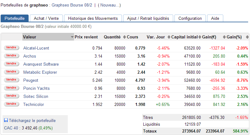 Je subis actuellement sur la watch list. J’avais décidé de conserver la position sur Alcatel Lucent, pensant qu’il serait difficile de faire pire. Mais ils ont réussi. Grâce à Fab56 j’ai pu écouter le responsable communication investisseurs d’Alcatel et c’était une preuve de plus qu’ALU devient une coquille de plus en plus vide. Du coup ce matin j’ai enlevé mon stop, à la vue de la réservation à la baisse en pensant, que soit ce serait un faux mouvement soit au moins que je pourrais sortir sur un rebond technique. Quelques problèmes logistiques m’ont ensuite empêchés de passer un ordre jusqu’à 13h30. trop tard. Du coup je conserve le solde de la watch list. C’est pas fantastique, mais on sauve les meubles après une semaine un peu olé olé niveau discipline.
