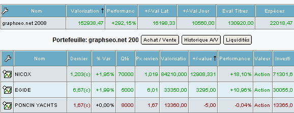 Je pense que l’on assiste maintenant à la fin de la hausse exponentielle court terme et donc à l’avènement d’une consolidation saine et bien méritée. il reste quelques valeurs encore qui n’ont pas procédé à leur rattrapage mais ce sont les dernières d’ou le fait que je pense que le marché se doit de souffler légitimement. En attendant je conserve les lignes Poncin Yatch et Egide tout en vendant et prenant les bénéfices sur la ligne de Theolia. Je reinvesti une partie des bénéfices dans une ligne supplémentair de Nicox avec un objectif de 1,50 euros sur celle-ci.