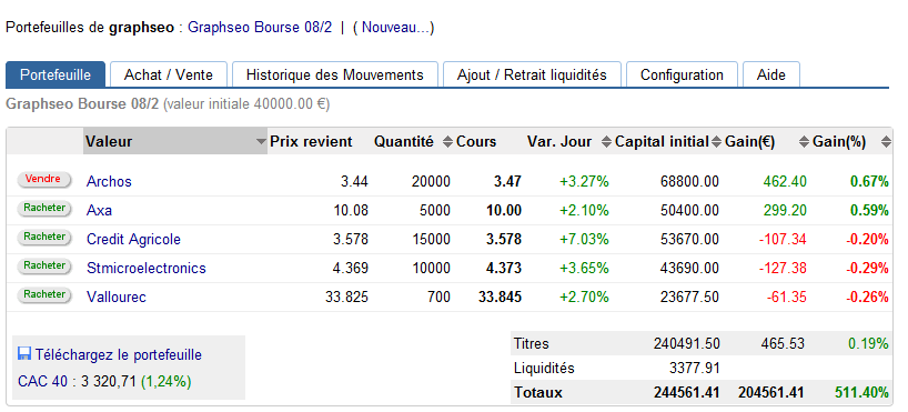 Je suis donc à nouveau passé baissier sur le portefeuille. Non pas pour jouer une reprise baissière car je pense que ce que nous venons de vivre sur le cac 40 est un signal fort de hausse ces prochaines semaines, enfin si des actes vient supporter les discours… cependant à court terme j’ai donc soldé ma position sur Alcatel, d’une part car elle était fortement risquée car les 3/ de mon portefeuille était investi dessus, puis car contrairement à ce que je pensais , elle a sousperformé l’ensemble de la cote, un manque à gagner donc un mauvais trade. J’ai cependant conservé les actions Archos qui doucement mais surement semblent vouloir rebondir.