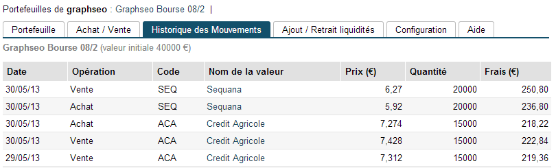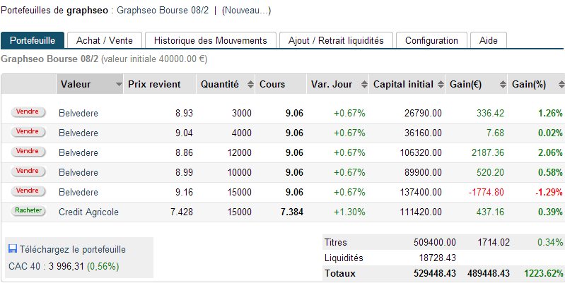 Pas grand chose de différent sur la watch list à ce soir. on a les mêmes actions en portefeuille. Sauf que j’ai profité de cette journée pour faire quelques arbitrage heureux avant de revenir aux sources. Ainsi j’aurai loupé Archos que j’avais annoté en surveillance forte au début du mois puis à divers commentaires, mais je n’aurai au moins pas loupé Sequana. ce matin devant la volonté apparente de ne pas baissier, j’ai soldé ma vente à découvert sur crédit agricole avec un maigre gain. Mais je me suis tout de suite positionné sur Sequana à l’achat face à des signaux d’achat à moindre risque qui se sont réveillés. Je suis donc rentré à l’achat sur le titre pour participer à la première montée. Deux montées ont suivi, j’ai pris mes bénéfices; Je suis revenu en vente à découvert sur Crédit agricole.