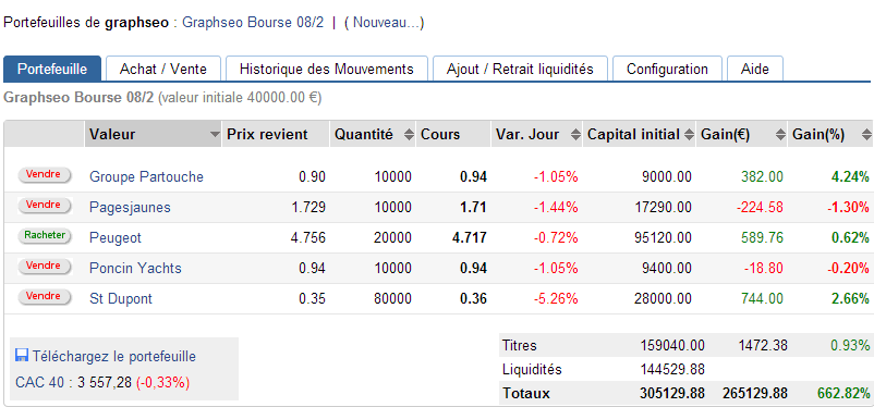Pour ce qui est des grosses capitalisations. La hausse du cac 40, exponentielle, dans un biseau ascendant très court terme, laisse présager d’une consolidation autour des 3530 points. Dans cette optique, j’ai ajusté mon portefeuille. Globalement, tant que l’on demeure au-dessus des 3530 points la tendance du cac 40 est clairement haussière. Les positions baissières se doivent donc d’être dans une optique de trading court terme, et il ne faut donc pas hésiter à prendre ce que le marché offre.