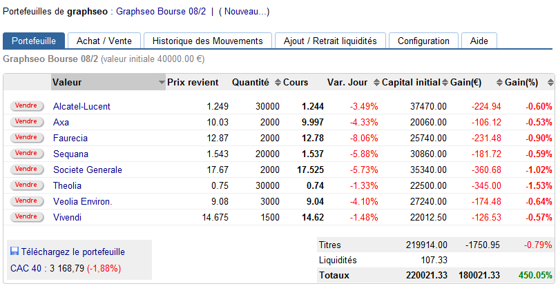 Comme dit dans l’analyse cac 40, j’ai soldé vers 17 h mes ventes à découvert profitant d’une accélération de la baisse, le cac 40 arrivant en approche des 3180, et je doute que les 3147 soit atteint sans un rebond intermédiaire voir pas du tout. Di coup peu avant la clôture je suis repassé à l’achat sur plusieurs titres comme alcatel, axa, société générale, sequana (assimilation nouvelles actions lundi), Theolia, Veolia et Faurecia (je veux profiter de l’effet Peugeot mais sans y être investi). C’est un peu risqué d’avoir pris des positions acheteuses sans signal, suivant l’ouverture lundi cela pourra être rapidement soldé. Je tente un rebond fin de séance sur indices américains en me disant que les acheteurs même si faibles, ne lâcheront pas la partie si facilement, surtout après le signal donné la semaine dernière au-dessus des 3147 points. Au pire je pense que c’est légèrement trop anticipé comme achats, mais comme cela, cela vous laisse le temps lundi de vous positionner plus correctement si toutefois le marché me donne raison. Bon trades et bon weekend.