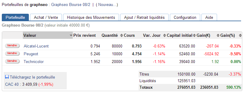 De la cassure des 3447 points sur le cac 40 aujourd’hui résulte le pétage de pas mal de stops sur mes positions. J’ne conserve trois, dont les stops ne sont pas encore atteints. Je conserve Alcatel au-dessus des 0,769€, Peugeot dans un biseau descendant court terme, que je conserve au-dessus des 5,71€ et Technicolor, pas de signal de vente, je conserve au-dessus des 1,92 euros. Je préfère rester liquide sur le reste du portefeuille. La séance fut volatile et rapide, un rattrapage est possible en rebond technique, mais il est préférable d’observer justement la réaction du marché pour savoir si cette alerte, n’en est qu’une, où si le marché va aller chercher rapidement ses supports majeurs 3290-3350. Je m’abstiens donc et observe.