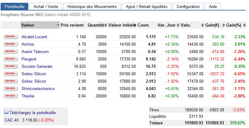 En ligne avec une opinion plus d’accumulation à l’achat je conserve le solde de la watch list graphseo avec notamment les actions que je trade actuellement à titre perso comme Alcatel qui se comporte toujours aussi bien et st micro electronics dont j’attends une réaction forte tout comme soitec ou encore theolia, Archos, Avenir Telecom. Peugeot également devrait enfin rebondir et je garde toujours une bancaire en cas de bonne nouvelle du côté crise europe (on peut toujours rêver :-) )