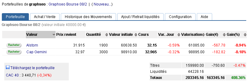 La position sur Alcatel est rachetée (+5,58%) et psychologiquement on passe la barre ds 400% que j’avais abandonnée voilà une année avec plusieurs mois bien difficiles à gérer. Je n’abandonne pas l’idée de continuer à la shorter plus tard mais là je préfère arbitrer vers cap gemini en attendant