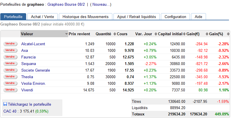 Le rebond technique s’est validé aujourd’hui, j’ai conservé la moitié des positions acheteuses tant que nous restions au-dessus des 3174 points. devant tant de fragilité j’aurais du tout larguer mais les futurs US étaient encourageants, ce qu’ils ne sont plus du tout maintenant. Je vendrais donc certainement tout le reste demain matin en ouverture de la bourse de Paris si ouverture sous 3174 ce qui est maintenant plus que probable. Du volume sur Sequana mais une nouvelle désillusion. Sous 1,61 il convient de rester à l’écart, mais maintenant que j’y suis je vais payer pour voir, avec l’atteinte du prix de l’augmentation de capital et les volumes le titre est suffisamment liquide pour que j’y reste au-dessus des 1,48 avec ma position.