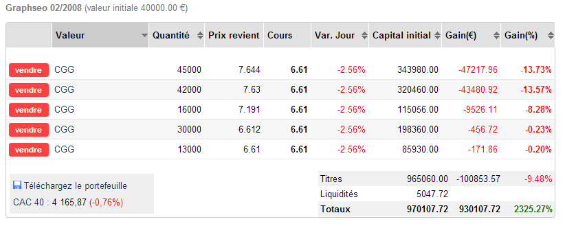 Je me prends une bonne claque bien méritée. Mais voilà ce que l’on mérite lorsque l’on applique pas avec discipline une stratégie de moindre risque. L’avantage étant que je ne suis pas au SRD, que CGG est massacrée, et qu’il finira bien par avoir un rebond à un moment ou à un autre. J’ai donc aujourd’hui préféré solder mes autres positions pour débloquer des liquidités supplémentaires pour rentrer de nouvelles lignes sur CGG. Ceci n’est pas un conseil. Ici je tente un coup de poker pour essayer de récupérer la situation. Je ne vais pas plus justifier cette nouvelle prise de position pour ne pas vous induire en erreur. C’est ma décision et je ne conseille absolument pas de faire comme moi. Seul un débordement des 7 euros rendrait un achat sur CGG moindre risque. Nous en sommes donc encore loin. Si demain nous n’étions pas en mesure de conserver les 6.50 alors je larguerai tout en plusieurs fois et ça va me prendre du temps bien évidemment au vu de la pose.