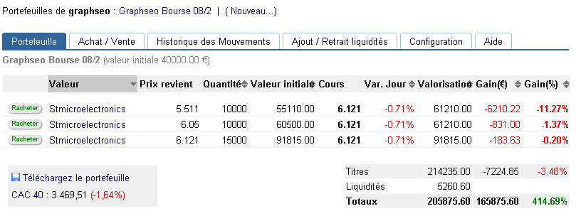 Position de vente à découvert sur Alcatel Lucent rachetée. Position de vad sur ST micro triplée. Ce qui est un peu risqué étant donné que le titre fait une bonne résistance alors que le CAC 40 arrive non loin de son objectif baissier avant certainement un petit rebond intermédiaire. On coupe au-dessus des 6,17 euros.