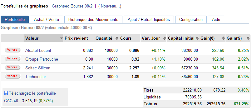 J’avais bien fait de me montrer méfiant face à ce marché.? Aussitôt fébrile, aussitôt à nouveau fort. Bien entendu il manque de la confirmation. Mais face à la tenue des 3480 points et surtout à la volonté haussière de reprendre les 3492 points j’ai décidé de rentrer à l’achat sur les titres auxquels je suis habitué, à savoir Soitec, Alcatel et Technicolor. J’avais pris aussi en plusieurs fois une ligne sur Groupe Partouche. Je n’ai pas vu venir la hausse d’Archos. La rupture des 3€ l’avait affaibli, mais son nouveau franchissement l’a renforcée, dommage je n’avais pas placé d’ordre d’achat à seuil de déclenchement. Pour Nicox, les 2,45€ qui étaient mon objectif de rebond, furent atteints, également, mais mauvais timing et fin de mois SRD m’avait fait lâcher la position. Dommage de n’avoir pas suivi la bonne tenue du titre aujourd’hui au-dessus des 2,25€ (ce que je vois après coup).