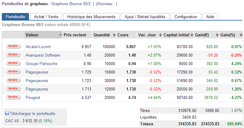 Chaque jour qui passe nous rapproche de la consolidation baissière, mais pas encore, pas encore. Le support des 3575-3583 points fonctionne parfaitement, il s’agit donc d’un point pivot validé par le marché ce jour et j’en prends note. J’ai donc conservé mon portefeuille ce matin du fait de la bonne résistance des valeurs en son sein. Puis Maintenant au-dessus des 3575-3583 points je conserve toujours. Alcatel est toujours dans un tirangle symétrique à très court terme, il faudra rompre 0,89€ pour relancer la hausse vers 0,98€. Peugeot se réveille et semble avoir trouvé un bon support d’achat. Quant à Pages Jaunes, cela consolide gentillement. J’ai arbitré des St dupont contre des Avanquest aujourd’hui suite à la liste des 23 actions à acheter pour 2013.