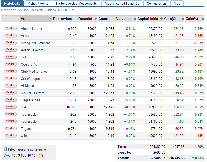 J’ai pris la décision aujourd’hui de replacer mes liquidités sur toutes les actions dont j’ai pu faire une analyse récemment. Mon but est d’obtenir un portefeuille plus équilibré. Maintenant que la performance devient très confortable, et le capital important, il convient d’adopter un portefeuille plus hybride. De plus mon activité salariée, me laisse de moins en moins le choix, il convient d’être un peu moins court terme et de privilégier à nouveau le swing trading. D’autant que comme on a pu le constater dernièrement sur pas mal de graphiques, plusieurs actions semblent se débarrasser actuellement de leur tendance baissière de 2008. On pourrait donc bien se trouver à un tournant, l’occasion donc , pour celles et ceux qui travaillent et disposent de moins de temps de s’intéresser à la bourse.
