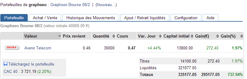 Alors que je souhaitais rester liquide, c’était sans compter que j’avais laisser traîner une épuisette sur Avenir Telecom qui s’est activée pendant mes vacances pour 30 000 titres donc, à 0,46€. Le titre me paraît intéressant bien que spéculatif, puisque il évolue encore proche de ses plus bas sans avoir encore pu, pour le moment, profiter, de l’engouement, revenu, sur les petites capitalisations boursières de la cote. A suivre donc, même s’il manque vraiment du volume pour mettre le feu aux poudres. Dans un premier temps, un test des 0,52€ serait intéressant, mais c’est la cassure de ce niveau qui permettrait vraiment au titre de se défaire de sa tendance baissière de fond. A suivre.