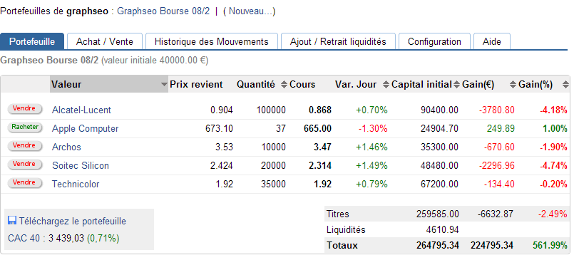 Un rebond sans volumes sur les indices boursiers aujourd’hui donc à prendre avec méfiance. J’ai continué de sur pondérer à l’achat notamment avec des actions de Technicolor, même si à terme je ne suis pas convaincu de la tenue haussière des marchés comme vous avez pu le lire dans ma prévision de tendance du cac 40 pour octobre, même si donc à court terme je doute que les acheteurs plient aussi facilement surtout après un rallye haussier qui a permis à la tendance haussière de fond de se confirmer. Une baisse suite à cela, ne se met pas aussi facilement en place, des hésitations et arbitrages sont longs avant qu’une nouvelle tendance de marché se dégage, en attendant, cela devrait rester volatile dans un sens et dans l’autre au gré des rumeurs et annonces. Le genre de situation dont je me méfie comme de la peste.