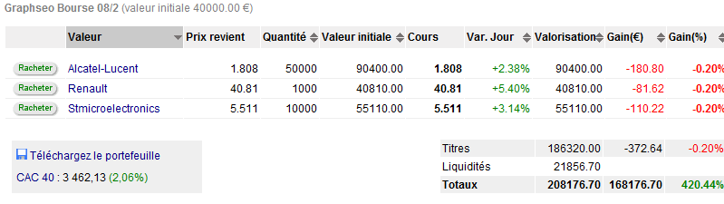 Je reprends des positions de vente à découvert sur trois principaux titres : alcatel, st micro et renault. Il y a deux choix maintenant, soit nous avons affaire à une reprise en V, donc reprise en main des acheteurs forte et attaque à fortiori de la résistance des 3550 points. Soit ce n’est qu’un pullback sur la cassure baissière du biseau ascendant. Pour le moment rien ne peut affirmer l’une ou l’autre de ces hypothèses et avec Athènes ce soir ou demain matin avant ouverture, c’est plus que spéculatif tout ça. Néanmoins j’ai décidé de prendre quelques risques en prenant position en vad sur trois valeurs. Elles devraient consolider en intra day puis on verra selon les marchés us. Je pense toujours à moins d’un retournement de tendance flagrant solder mes positions ce soir avant clôture, je n’apprécie que trop peu les effets d’annonce.